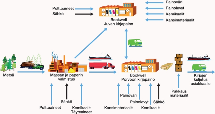 Elinkaari on laskettu metsästä asiakkaalle -rajauksella, eli kirjan elinkaarta on seurattu Bookwellin asiakkaille asti.
